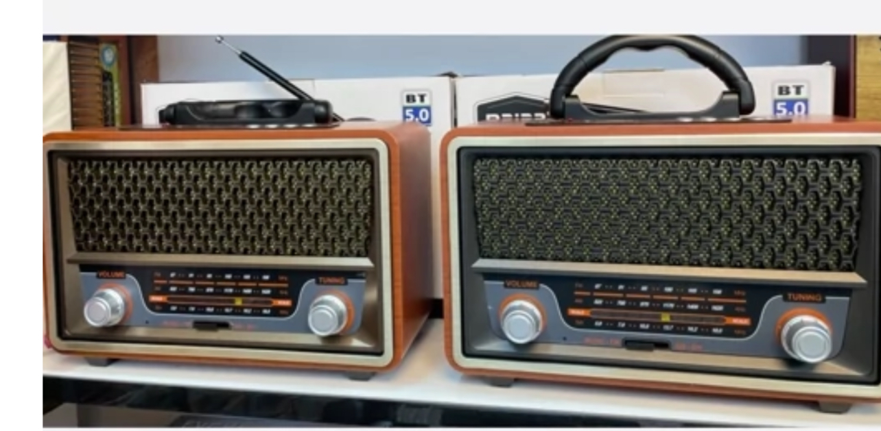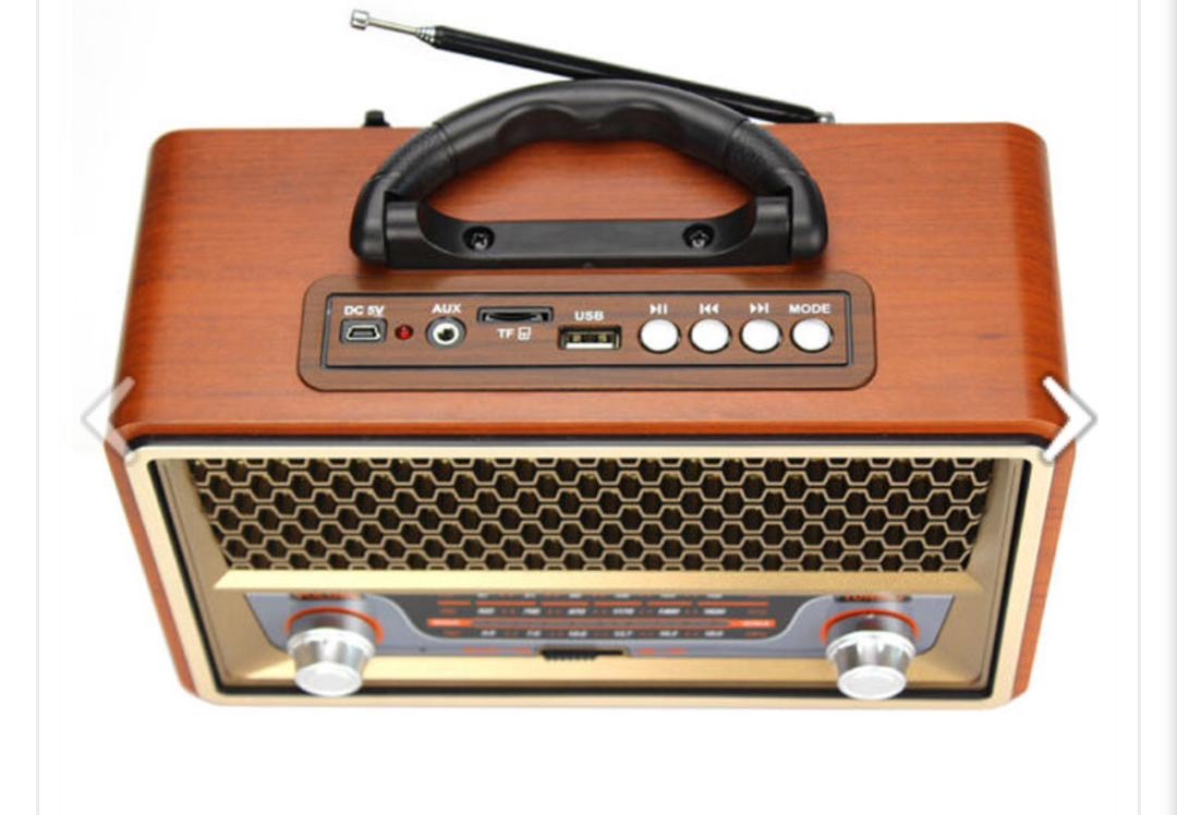 سه موج رادیو ، فلشخور رمخور ، شارژی ، برق مستقیم شهری ، بدنه تمام چوبی ، کنترل دار ، دسته قابل حمل