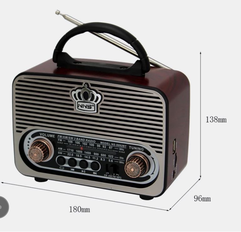 رادیو سه موج FM AM SW ،فلشخور رمخور ، شارژی ، بلوتوث دار، باطری شارژی 18650 قابل تعویض ، باطری بزرگ هم بهش میخوره ، قابلیت شارژ با کابل تایپ سی ، دسته قابل حمل